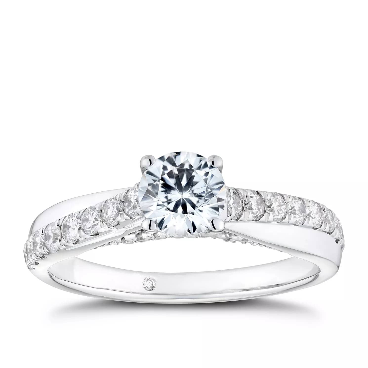 Les diamants sont éternels. Une bague en or blanc 18 carats magnifiquement conçue présente fièrement un solitaire Forever diamant. Un voleur étincelant de projecteurs, cette charmante bague en diamant présente également des détails scintillants à la fois autour et en dessous de la pièce centrale, avec un design en croix conjoint scintillant mettant en valeur le corps en or blanc. Le mot «FOREVER» est gravé à l’intérieur de la bague, avec un éclat supplémentaire prenant la place du «O». Une touche spéciale et sentimentale, la manière parfaite d’exprimer à quel point un être cher compte pour vous, pour toujours et toujours. Le Forever diamant a une coupe de fleurs unique composée de 73 facettes, le résultat est un éclat et un éclat exceptionnels. Le poids total du diamant pour cette bague est de 1ct.