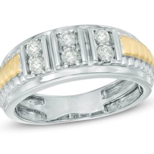 Éblouissante et distinguée, cette bague anniversaire en diamant fait forte impression. Fabriquée en or bicolore 10K, cette bague présente trois duos de diamants accrocheurs sertis dans des canaux verticaux au centre du design. La tige étagée en or jaune et blanc ajoute de la profondeur et de la dimension au design. Scintillant avec 1/2 ct. deux diamants et polie pour un éclat brillant, cette bague convient à son style confiant.