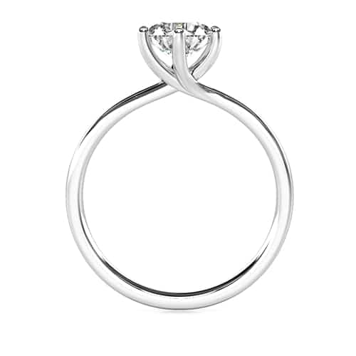 Une bague de fiançailles en diamant solitaire. Le diamant rond se trouve dans un cadre à 6 griffes. La tige a un profil de court qui est conçu comme une monture Wedfit.