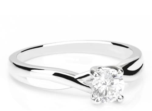Cette magnifique bague en pierre unique est devenue un design populaire auprès de nos clients. Un diamant de taille ronde se trouve dans un sertissage à 4 griffes, avec la bande unie torsadée à l’infini.