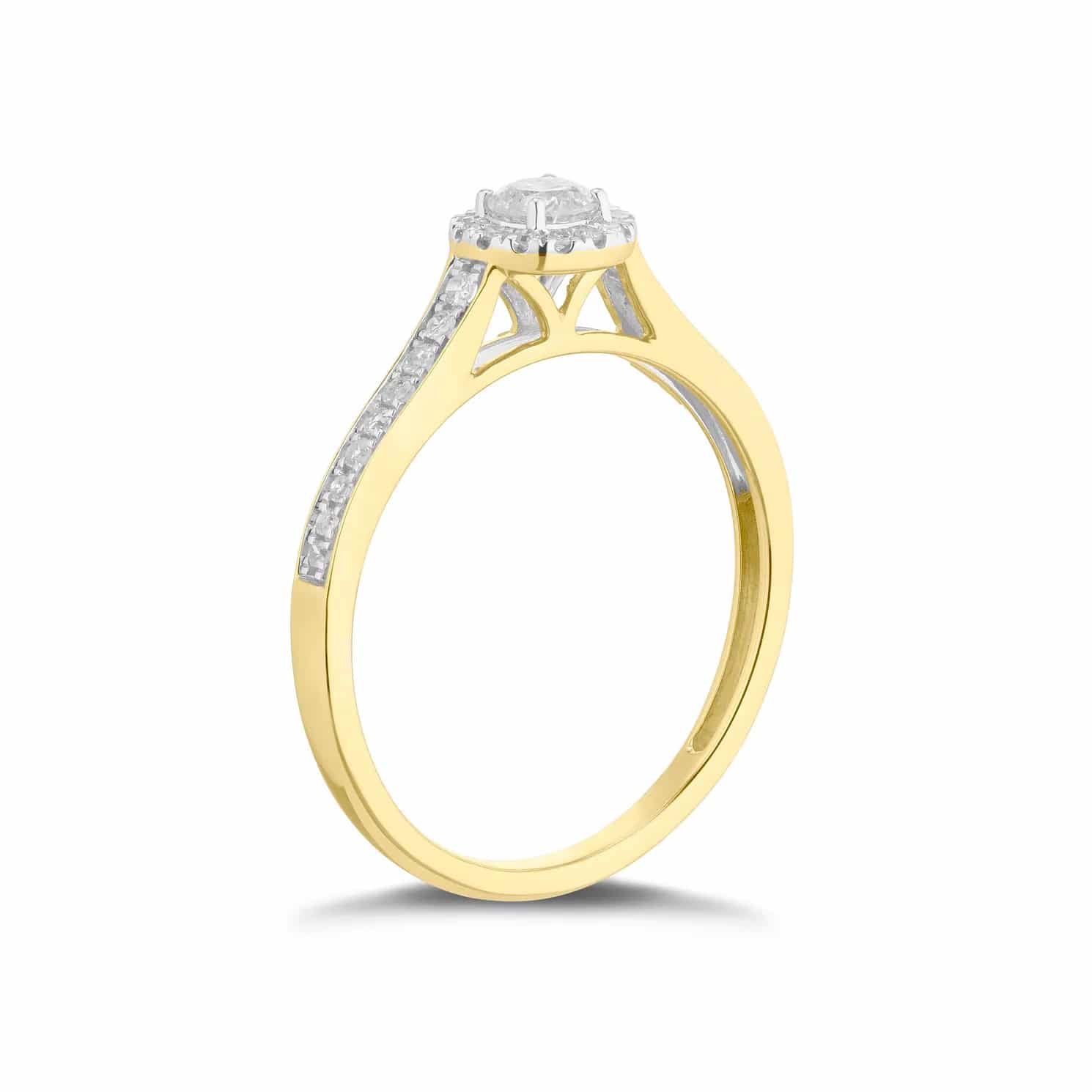 Cette bague en diamant divin, magnifiquement créée en or jaune 9 carats, présente des épaules en pierre scintillante menant à la pièce maîtresse ronde captivante. Un diamant solitaire taille brillant se trouve dans un sertissage à quatre griffes, entouré d’un halo rond scintillant avec d’autres pierres brillantes. Le poids total des diamants de cette bague est de 0,33 ct.