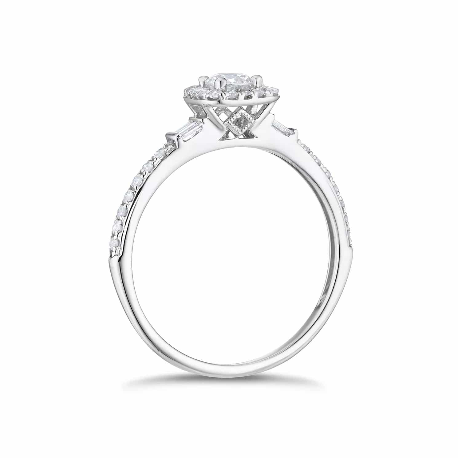 Fabriquée en or blanc 9ct chic, cette bague en diamant scintillant présente une élégante tête en forme de coussin. Un centre de diamant solitaire taille brillant est entouré d’un halo de pierres scintillantes. Des diamants taille baguette complimentent les épaules, et d’autres pierres scintillent sur la tige. Le diamant total de cette bague est de 0,50 ct.